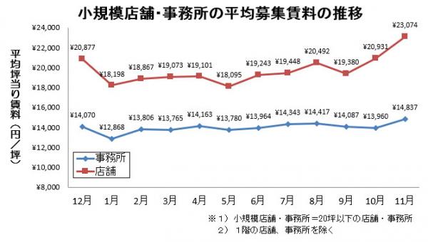 小規模店舗(20坪以下)の平均募集賃料は、9月から2ヶ月連続で上昇しており、前月からは10.2%と大きく上昇しました。