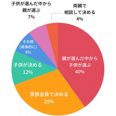 どのように第一志望校を選ぶかたずねてみました。「親が選んだ中から子供が選ぶ」が40%と最も多く、次いで「家族全員で決める」が約29%、「子供が決める」が12%、「その他」が8%、「子供が選んだ中から親が選ぶ」が7%、「両親で相談して決める」が4%という結果になりました。