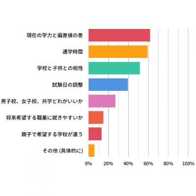 志望校や併願校を選ぶ時に悩んだことを教えていただきました。上位3つに入った「現在の学力と偏差値の差」が60%強、「通学時間」が60%弱、「学校と子供との相性」が50%強でした。