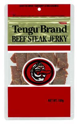 『テング ビーフステーキジャーキー』はアメリカ・ロサンゼルスで1970年代に誕生。以来、伝統の製法を守り続け、世界中で愛されているリーディングブランドです。人気の理由は、開発者が日系2世であったことで生まれた醤油ベースの味付け、そして厳選した牛赤身ももステーキ肉100%という原材料へのこだわりです。1袋100グラムのビーフジャーキーを作るためにおよそ3倍の牛肉を乾燥し、凝縮。密度のぎゅっと詰まった噛みごたえと、噛めば噛むほど深くなる味わいを実現しています。