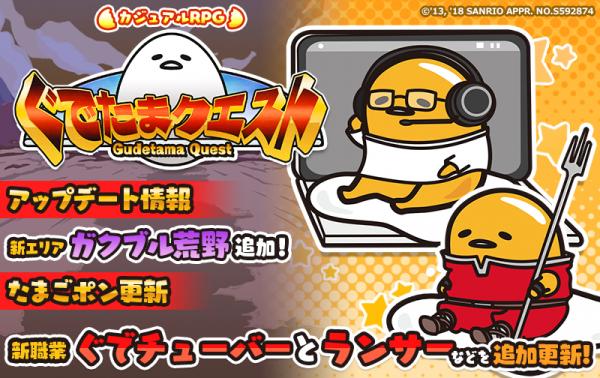 株式会社グッドラックスリー(本社:福岡県福岡市、代表取締役社長:井上和久、以下「グッドラックスリー」)とギャザリングホールディングス株式会社(本社:東京都千代田区、代表取締役CEO 戸田和宏、以下「ギャザリング」)は、株式会社サンリオ(本社:東京都品川区、代表取締役社長:辻信太郎、以下「サンリオ」)よりライセンス許諾を受け、人気キャラクター「ぐでたま」が登場するゲームアプリ『ぐでたまクエスト』(以下、本作)をにおいて、2019年1月3日(木)より、新たに第9エリア「ガクブル荒野」を追加した他、本作のガチャである「たまごポン」の更新を行ったことをお知らせいたします。