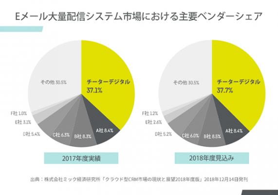 チーターデジタル株式会社(本社:東京都千代田区、代表取締役社長:橋本勇人、以下チーターデジタル)は、株式会社ミック経済研究所(本社:東京都港区、代表取締役社長:有賀章、以下ミック経済研究所)が2018年12月14日に発刊した市場調査レポート「クラウド型CRM市場の現状と展望2018年度版」において、自社が開発提供するMailPublisherシリーズが2017年度Eメール大量配信システム市場における主要ベンダーシェアNo.1(占有率37.1%)を獲得したことを本日発表いたします。