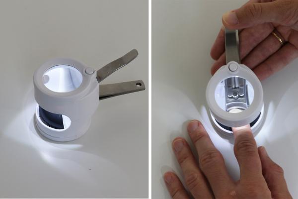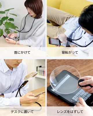 ストラップは、身体に負担がないように素材にこだわり、首に直接触れると痛いという方にも曲げ方を変えるだけで首に触れずに使用できる他、デスクで使える置き型ルーペとしても活躍します。