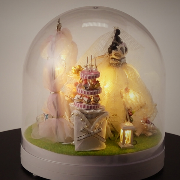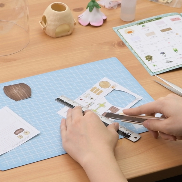 【ミニチュアット:U】は説明書を見ながら、小さなパーツをカッターやはさみで切ったり、付属の接着剤で貼りつけたりしながら、透明ドームの中に小さな世界を作るという「ミニチュア・ハンドメイド・キット」です。完成させるとLEDライトを光らせて小さな世界を彩ることが出来ます。