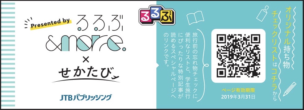 また、JTBパブリッシング運営のWebメディア「るるぶ&more.」「せかたび」と連動し、学生旅行向けの記事や、旅行前に便利な“持ち物チェックシート”がダウンロード可能なスペシャルコンテンツにアクセスできるQRコード付き特製しおりを、フェア開催中の書店店頭で配布します。