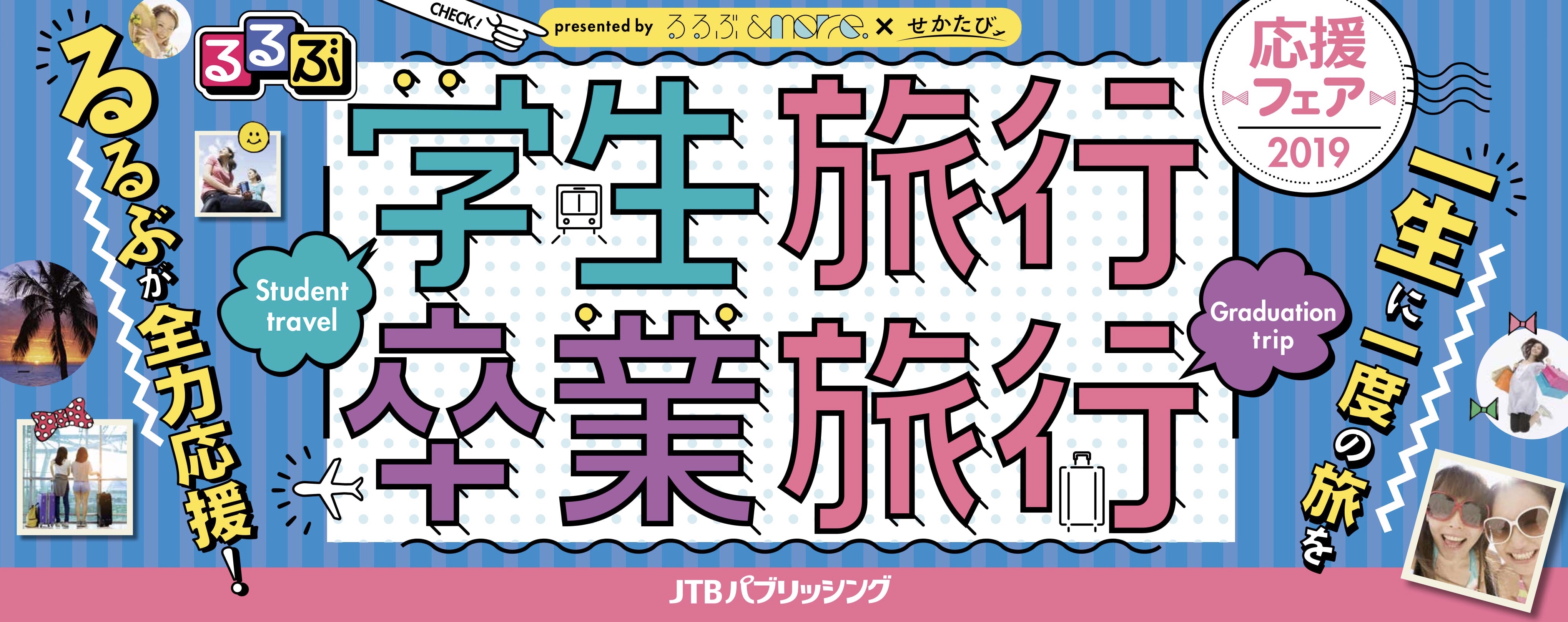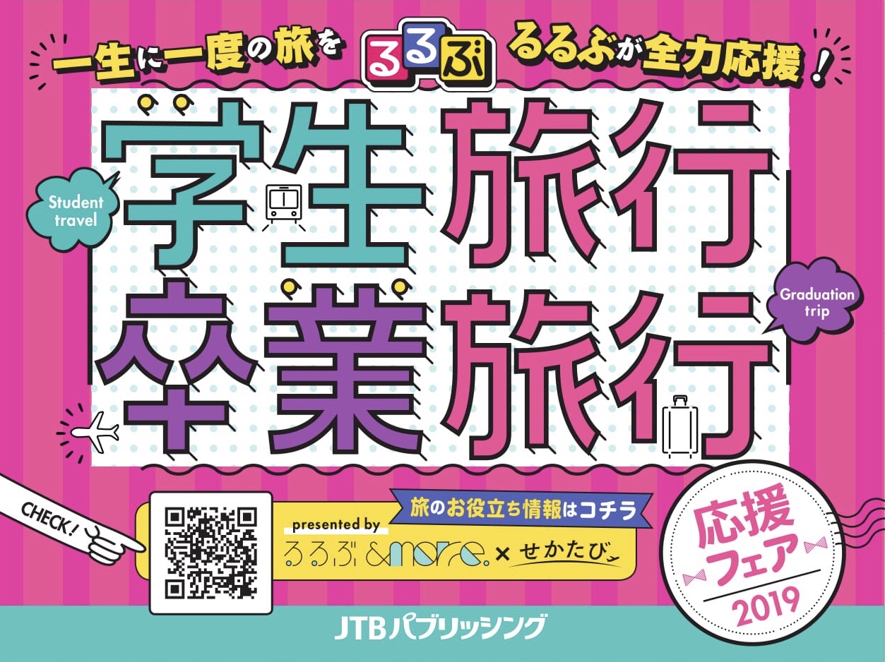旅行情報誌「るるぶ情報版」、Webメディア「るるぶ&more.」「せかたび」、JTBパブリッシングの図書とデジタルサービスが連動して、一生の思い出となる学生旅行・卒業旅行を応援いたします。