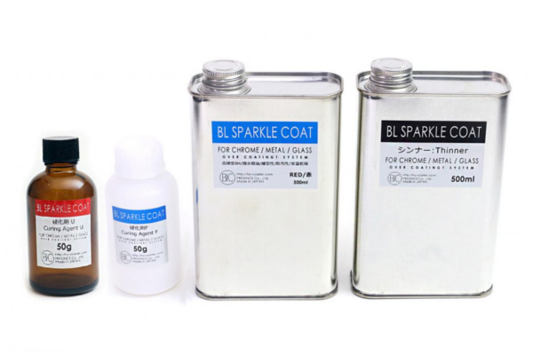 BL Sparkle Coat (BL スパークル・コート) は、特殊抽出によるナノシリカとアクリル樹脂の変性を主成分に開発された、最先端の無機有機ハイブリット塗料です。例えクロームメッキ処理が施され究極の鏡面状態を有する基材表面であっても、強靭な密着力を発揮致します。クロームメッキ、または蒸着メッキ処理後の基材表面 / ガラス / メタル各種等々、各種基材に幅広い密着性能を示し、各種機能性に富んだ優れた成膜を形成致します。