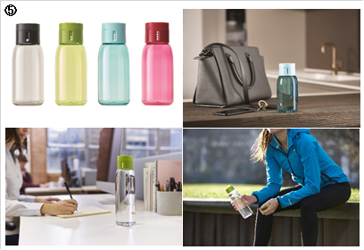 (5)「カウンター付きウォーターボトル ドット」は、飲んだ水分量を記録できるカウンター機能がついた、全く新しい発想のウォーターボトルです。フタ部分に1個~4個の「ドットを表示する機能」があるので、4ボトル目までカウントすることができ、自分が今どれくらいの水を飲んでいるのかが一目瞭然です。ボトル部分は衝撃に強く汚れにくいトライタン製で、食器洗浄乾燥機で洗えるので、とても衛生的です。