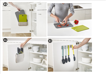 Joseph Josephは、商品だけでなく、デザインによってキッチン全体を美しく保つことも商品開発のコンセプトになっています。このコンセプトで開発された「ドアストア シリーズ」は、基本的なキッチンツールを壁面や扉の裏といったデッドスペースに貼り付けて収納することで、空間をより有効的に活用してキッチンを美しく保つことができる商品です。