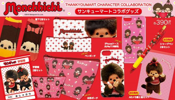 店内全品390円(税別)でおなじみの「サンキューマート」では、世界中で大人気!おしゃぶりポーズにそばかすがチャームポイントのキャラクター「モンチッチ」コラボ商品を大好評発売中!
