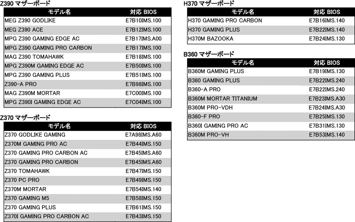 MEG Z390 GODLIKE / MEG Z390 ACE / MPG Z390 GAMING PRO CARBON / MPG Z390 GAMING EDGE AC / MPG Z390M GAMING EDGE AC / MPG Z390I GAMING EDGE AC / MAG Z390 TOMAHAWK / MAG Z390M MORTAR / Z390-A PRO
