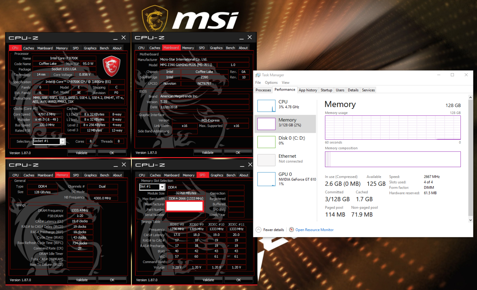 2019年1月16日 - Micro-Star International Co., Ltd. 台湾・新北市 - マザーボードの設計で世界をリードするMicro-Star International(MSI)は、弊社のIntel Z390マザーボードが世界で初めてメモリ標準化団体であるJEDECが新たに策定したDDR4 32GB(2048 x8)メモリモジュールへの対応を果たしたと発表いたしました。4 DIMM構成のMSI Z390マザーボードをお持ちのユーザーは、最新のBIOSにアップデートするだけで、1 DIMMスロットあたり32GBのDDR4メモリモジュールを利用できるようになり、最大128GBのメモリ容量を実現することができます。