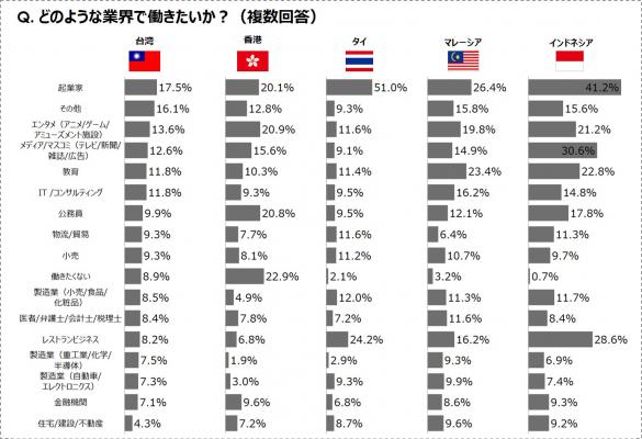 「どんな業界で働きたいか」(複数回答)を問う質問では、 「起業家」を選択する人がどの国でも多いという結果になりました。 すでに社会人として働いている人が多い中で、 いまの仕事に満足していなかったり、 いまとは異なる職業についてみたいという憧れのようなものがあるのかもしれません。