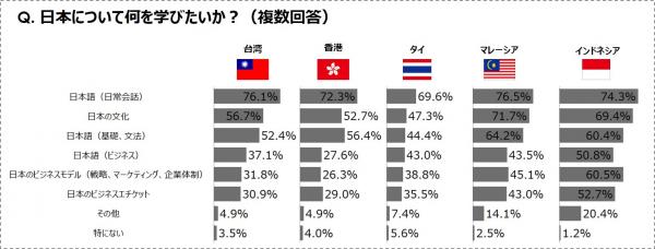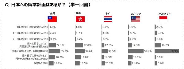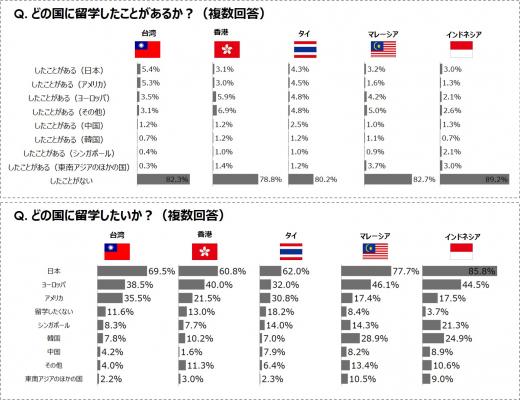 今回の調査で、留学経験のない人は多くの国で80%以上であることがわかりました。そんな中、「どこに留学したいか」の質問で、「日本」と答えた人は、インドネシア85.8%、タイ62.0%、マレーシア77.7%、台湾69.5%、香港60.8%で、「留学するなら日本!」という結果になりました。