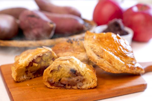 パイの中には、蜜いものスイートポテトの美味しさを引き立てる、こだわりのフィリング。爽やかな甘さのりんごとくるみ、和の味わいの十勝生まれのつぶあん、そしてシーズンで変わるフレーバー。他にはない「窯出し蜜いも ほくほく」ならではの美味しさです。