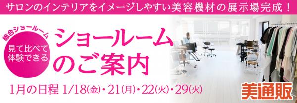 プロ向け美容材料の通信販売サイト「美通販」が、サロンのインテリアをイメージしやすい、美容機材の展示場を東京中野に完成させました。ご購入前にもっと知りたい商品が、見て比べて体験できる美容機材の総合ショールームとなっています。理美容機器などの大型商品からクロスなどの美容雑貨や消耗品まで、見たかった人気アイテムを幅広く展示しております。「美通販」では、多くのサロン様に商品をご覧いただきたく、第1回目となるショールームの見学会開催を決定いたしました。日時は1月18日(金)、1月21日(月)、1月22日(火)、1月29日(火)の4日間です。この機会にたくさんのサロン様にお越しいただき、体験していただきたい所存です。