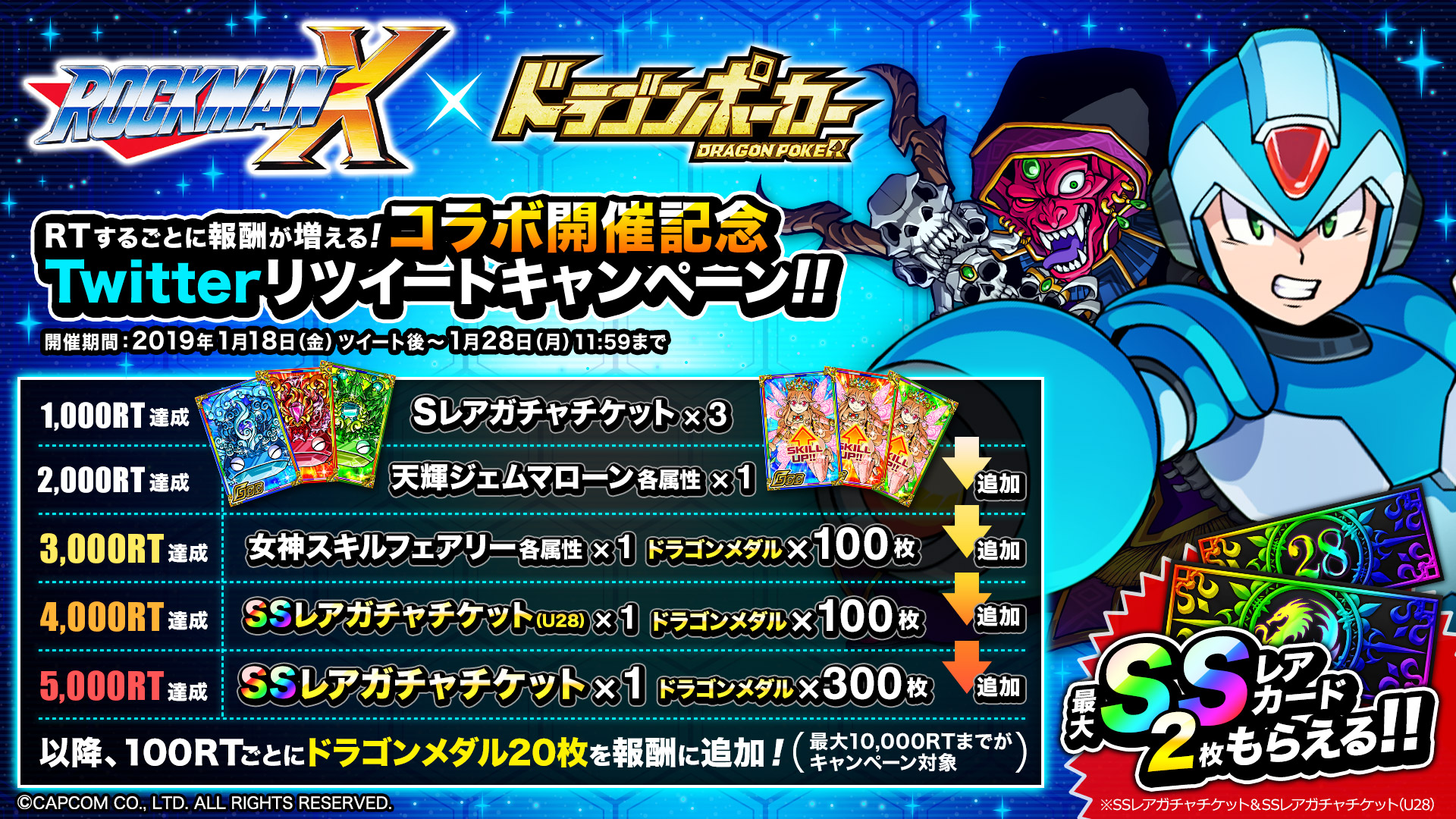 株式会社アソビズム(本社:東京都千代田区、代表取締役:大手智之)は、App Store・Google Playにて好評配信中のリアルタイム合体カードバトル『ドラゴンポーカー』で、2019年1月28日(月)より株式会社カプコン(本社:大阪市中央区、代表取締役社長:辻本春弘)のアクションゲーム『ロックマンX』とのコラボイベント開催を決定いたしました。コラボ期間中、「エックス」や「ゼロ」など『ロックマンX』のキャラクターたちが期間限定で登場!さらに、これを記念して、豪華報酬が手に入るリツイートキャンペーンも本日より開催!近未来を舞台に開催される夢のイベントをお楽しみにお待ちください!