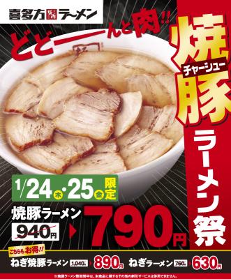 「喜多方ラーメン坂内」をFC 事業を展開する、株式会社麺食(めんしょく)(本社:東京都大田区、代表取締役社長:中原 誠)は、昨年に引き続き、“手作りのチャーシュー”をたっぷりと乗せた「焼豚(チャーシュー)ラーメン」通常価格940円を790円で販売する『焼豚ラーメン祭』を、2019年1月24日(木)・25日(金)の2日間限定で開催いたします。