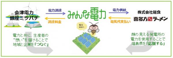 この度当社は、福島県発の電力を、福島県喜多方に本店を持つ「喜多方ラーメン坂内」の店舗で使用することが、“エネルギーの地産地消”ともいえ、新しい形での復興支援につながると考え、みんな電力との協業に至りました。