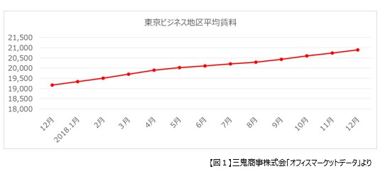 現在、東京ビジネス地区(千代田区、中央区、港区、新宿区、渋谷区)12月時点のオフィスビル平均空室率は、1.88%※2です。このオフィス空室率は5%を下回ると、不動産仲介業者が紹介できるオフィス物件がほぼ無い状況と言われています。平均賃料の推移を見ても、2017年12月から常に上がり続けていることがわかります【図1参照】。つまり現状では、オフィスの賃貸借契約の更新時に、賃料値上げ交渉をオーナーから受ける可能性が高いということです。しかもその提案は契約が切れる寸前に受ける事が多く、無条件でそのまま受け入れているのが現状です。