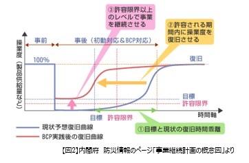 企業は、災害や事故で被害を受けても、取引先等の利害関係者から、重要な業務が中断しないこと、中断しても可能な限り短い期間で再開することが望まれています。また事業継続は企業自らにとっても、重要業務中断に伴う顧客の他社への流出、マーケットシェアの低下、企業評価の低下などから企業を守る経営レベルの戦略的課題と位置づけられます。