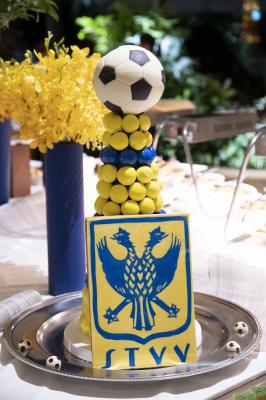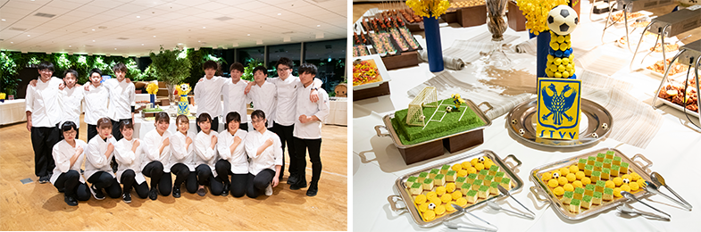 会場を華やかにしたいとの思いを込めた、シント=トロイデンVV のカラーを基調としたプチシュータワー。黄色と青のアイシングでコーティングしたプチシューを積み上げ、トップには大きなサッカーボールのチョコレートを飾りました。ケータリング用にはクッキー生地で被った黄色のクッキーシューにカスタードクリームを絞りました。