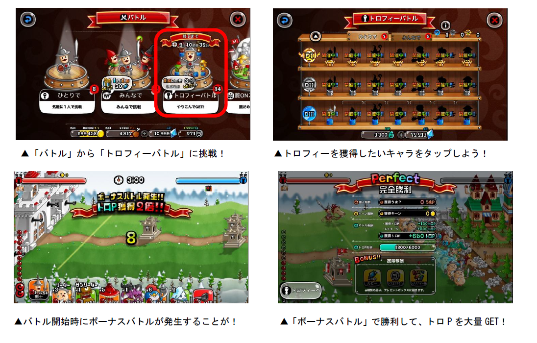 各キャラのトロフィーは、「トロP」を一定数貯めると獲得することができます。トロPは「キャラのLvが20以上」「うまP200以上」など、各キャラによって異なる条件を満たした状態でバトルを行なうと獲得できます。また、バトルを開始すると「ボーナスバトル」が発生することがあり、バトルの勝敗に関係なく、獲得トロPが2・3・5・10倍のうちいずれかの倍率で増加します。ボーナスバトルが発生したら、勝利してトロPの大量獲得を目指しましょう!