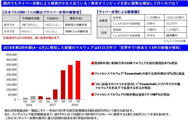 急激に増加しているサイバーアタックの件数が世界ベースで急増しているからです。サイバーアタックを仕掛ける者は、Windowsの脆弱性を狙って攻撃を仕掛けて来ます。その脆弱性を埋める為の手立てがアップデートと言う対策になります。日本国内でもサイバー攻撃によりかなりの被害が出ています。国民の3.2%に当たる400万人が攻撃を受けており、世界では100万人以上になり、総人口(75億5,000万人)の5%の割合と比較すると日本は少ないかもしれませんが、2020年には東京オリンピック/パラリンピックがありますので、確実にアタック件数は増加する事は確実です。