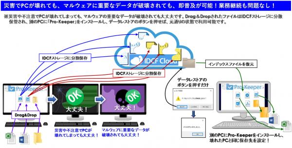 『Pro-Keeper for JS(judicial scrivener:司法書士向けソリューション)』 は、Windowsエクスプローラと同じ感覚で、日常使用している保管フォルダを監視指定すれば、文書を作成し、保存するだけの通常作業で、データはICDFオブジェクトストレージに安全に保管されます。IDCFオブジェクトストレージに保管されたデータは分割され、一断片はゴミ同然の意味の無い不完全なデータになっておりますので、外部業者に預けた物は不完全で意味の持った物ではありませんので、漏えいや改ざんに関する心配は一切要りません。クラウド事業者はハードウェアの障害、つまりハードディスク等のストレージの破損によって預かったデータを保持するために、データを複数複製しています。万が一ストレージが破損した場合、複製を取った物から瞬時にデータを復元してくれます。