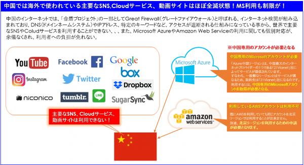 2017年の「インターネット安全法」に加え、2018年3月には新たにSNS規制が強化されました。中国のSNS 規制強化が進み、その影響で世界で利用されるSNSやDropboxやBoxなどのファイル共有サービス、或いはG-mailも利用できない。また、マイクロソフトのAzureやアマゾンのAWSに関しても既に保有しているアカウントを利用する事が出来ないため、中国に対する個別のアカウントを新規に作る必要があります。