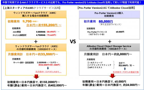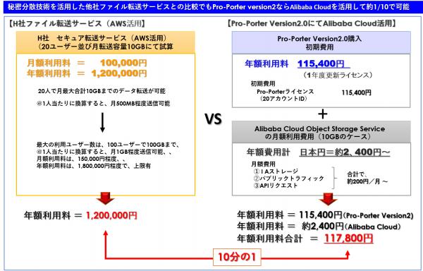 しかし、『Pro-Porter Version2.0』では、利用者の制限もありませんし、送りたいデータ(ファイル)の容量制限もありません。ファイルを送り、そして受取る為の対象となる利用者のライセンスは年間のサブスクリプションなので、増減も簡単にできますし、送ったファイルの容量に応じて課金されますので、送ったファイルの総容量に1GB当たり約20円掛ければ、月の課金費用は簡単に試算できます。ファイルを受け取り一時的に預かるストレージは、『Alibaba Cloud Object Storage Service』になりますので、他のクラウドストレージサービスと比較しても遜色ない安定性を保っておりますので、安心して利用することが可能です。
