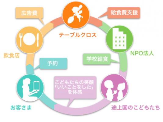 「テーブルクロス」とは、飲食店の予約をするとその予約人数分と同数の給食を途上国のこどもたちに届けることができるグルメアプリです。予約という日常の行動が、誰かのためになるという新たな寄付活動「チャリティ予約」を日本の文化として普及させることを目指しています。