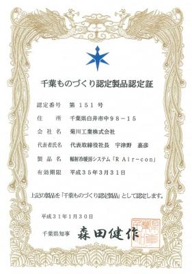 千葉県では、中小企業が開発・製造しており、かつ優良あるいは独創的な製品を「千葉ものづくり認定製品」として認定し、広く情報発信するとともに、製品の販路開拓を支援しています。第13回目となる今回の認定および交付式では、菊川の「Rエアコン」の他に、計15社の製品が認定を受けました。