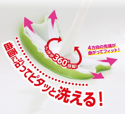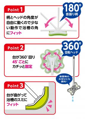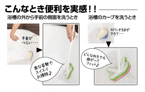 近年の浴槽は形状がさまざまで不規則な曲面が多く、従来の角度が固定された柄付クリーナーでは、角度に合わせにいくことで腕や手首に負担がかかります。このクリーナーは、そのような曲面にも楽にフィットする構造で、毎日のお風呂掃除がとても簡単に楽な姿勢で行えます。
