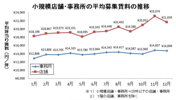 小規模店舗(20坪以下)の12月度平均募集賃料は、前月から-6.2%と大きく下降しました。