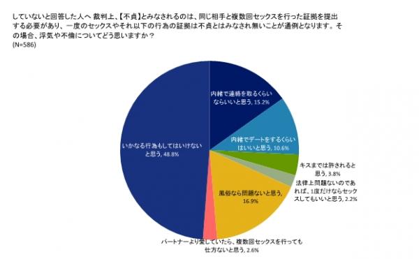 また、【設問1】で「浮気・不倫をしたことがない」と答えた586人に【設問2】を投げかけたところ、1度のセックス・もしくはそれ以下の行為では法律上不貞とみなされない可能性が高いという事実を認識した場合、「いかなる行為もしてはいけないと思う」と回答した人が286人(48.8%)と、半数を下回る結果に。