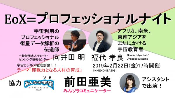 今年度最後の、宇宙ビジネス創出「EoX=」は、「宇宙のプロフェッショナル」をテーマとしたトークイベントを開催します。