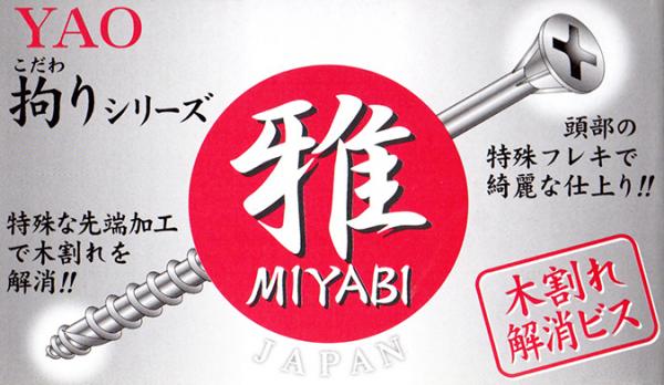 八尾製鋲株式会社(大阪府河南町、社長・河野伸幸)では、半透明樹脂ケース入り・少量ユーザー対応の人気シリーズ「プラパックミニ」に木割れ解消ビス「雅・MIYABI」を加え、2月中旬から販売を開始いたします。木割れ解消ビス「雅」は、弊社の「タピックス」をベースに改良を行い、その進化形として発売した製品です。先端部のねじ山ピッチを従来に比べて短くし、ビスが木材に入った途端、ねじ山のエッジが短いストロークで木の繊維を強力に切断することで、打ち込みの確実性を高めるとともに、木割れが起こるリスクを解消します。また、安心のメイドインジャパンをあらわす日の丸モチーフの包装デザインが建築業界で注目を呼び、上記の性能と相まって、多くのプロユーザーが指名買いするヒット商材となっております。この度の「プラパックミニ」への追加によって、大量需要のプロユーザーだけでなく、DIYを楽しむ一般のお客様との接点がいっそう広がり、ホームセンターなどの店頭を通じて、より多くの方々が「雅」の優れたパフォーマンスを手軽にお確かめいただけるものと考えます。なお、販売取り扱いの商社・小売店などの詳細につきましては、八尾製鋲営業部に直接お問い合わせください。