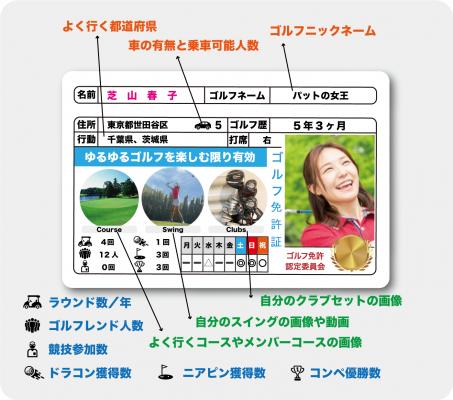 名前、生年月日、住所やよくゴルフで行く地域やスコア記録まで、いくつかの質問に答えるだけで自分のゴルフ免許証が完成します。