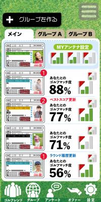「世界初のゴルフマッチ度」は、この数値を見れば自分に合ったゴルファーや誘いやすい友達がすぐにわかり誘いやすくなっています。主として、行動パターンと休みの日回りたいゴルファーの双方の一致がマッチ度を高めます。