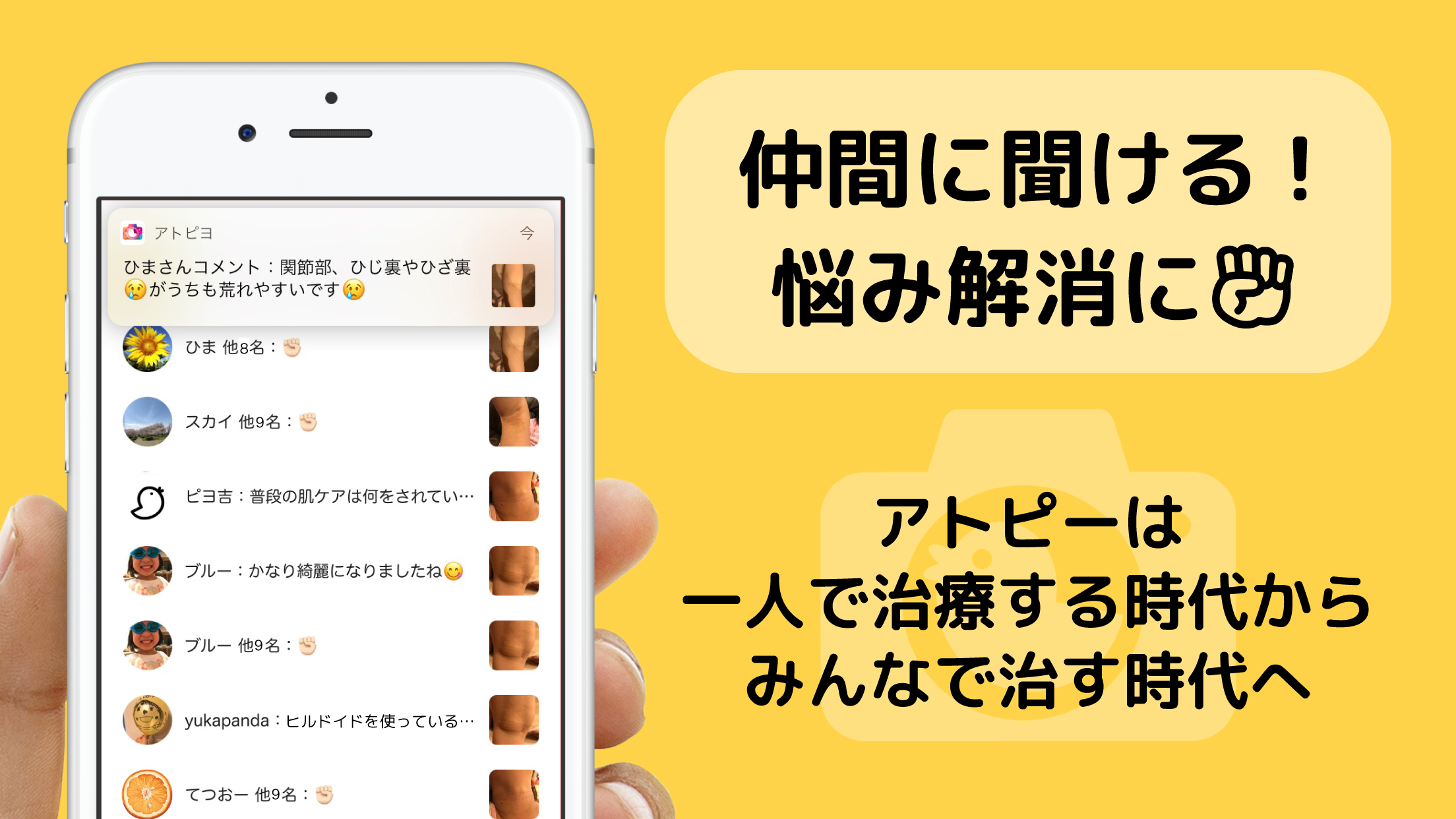アトピヨは、文字ではなく「画像」を投稿することで、アトピー特有の皮膚症状(状態)を匿名で共有できる日本初のアプリです。画像は部位ごとに時系列表示され、(1)長期治療経過の見える化、(2)悩みや症状の共有ができます。アトピーを発症し悩んでいる方々の早期回復のサポートになることを目指しています。