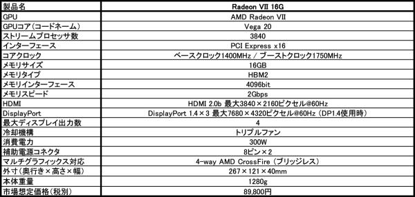 本製品は、TSMC7nmプロセス技術を採用した世界初のゲーミングGPUで、従来の14nmプロセス版Radeon RX Vega 64のストリーミングプロセッサ4096基よりも少ない、3840基のストリーミングプロセッサを有効にしたVega 20コアを採用し、その動作クロックをベースクロック1400MHz / 最大ブーストクロック1750MHzに高めることにより大幅な性能アップを実現。また、グラフィックスメモリにはメモリスピード2GbpsのHBM2メモリを16GB(4096bitインターフェース)搭載し、そのメモリ帯域は1TB/sに達します。