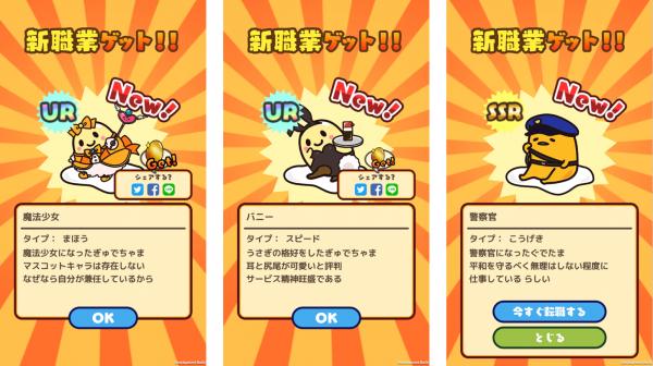 攻撃タイプ職の「警察官」(SSR)が新登場となった他、スピードタイプ職「バニー」(UR)が再登場!また、ゲーム内で獲得できるGP(ぐでたまポイント)を使って無料で回せる「GPのたまごポン」も更新、新たに「エクソシスト」(SR)が追加更新されました。