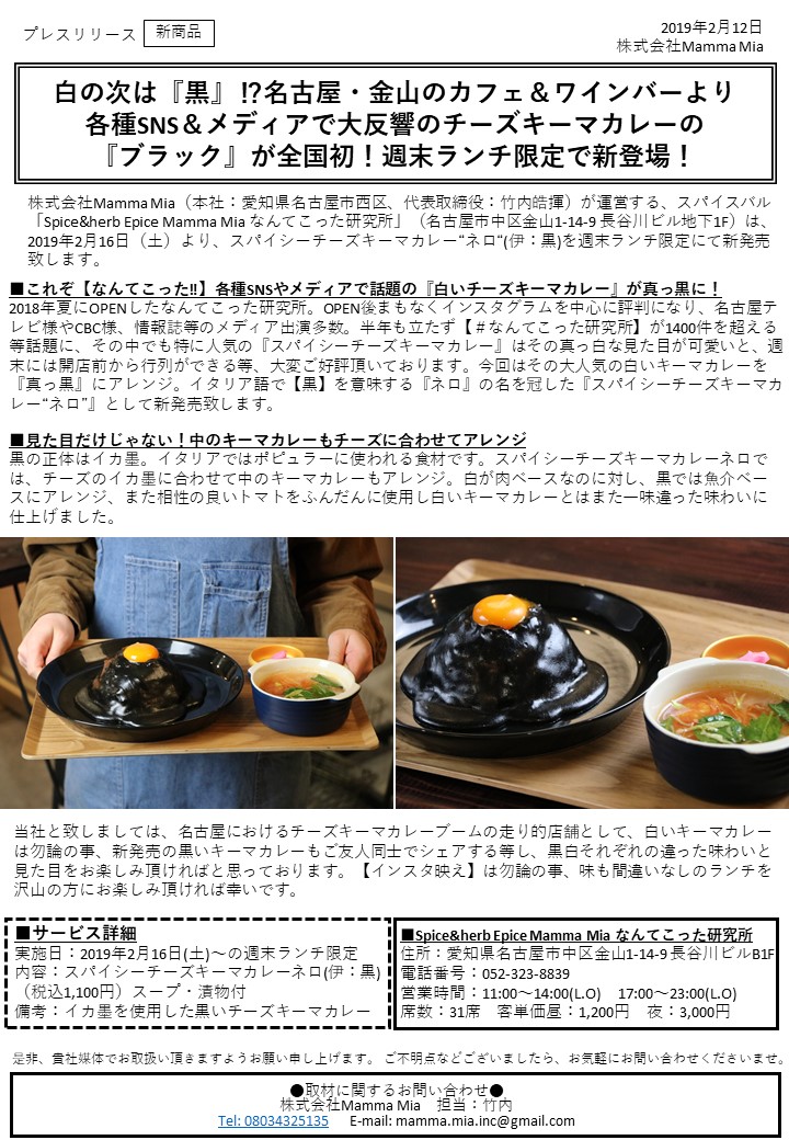 株式会社Mamma Mia(本社:愛知県名古屋市西区、代表取締役:竹内皓揮)が運営する、スパイスバル「Spice&herb Epice Mamma Mia なんてこった研究所」(名古屋市中区金山1-14-9 長谷川ビル地下1F)は、2019年2月16日(土)より、スパイシーチーズキーマカレー“ネロ“(伊:黒)を週末ランチ限定にて新発売致します。