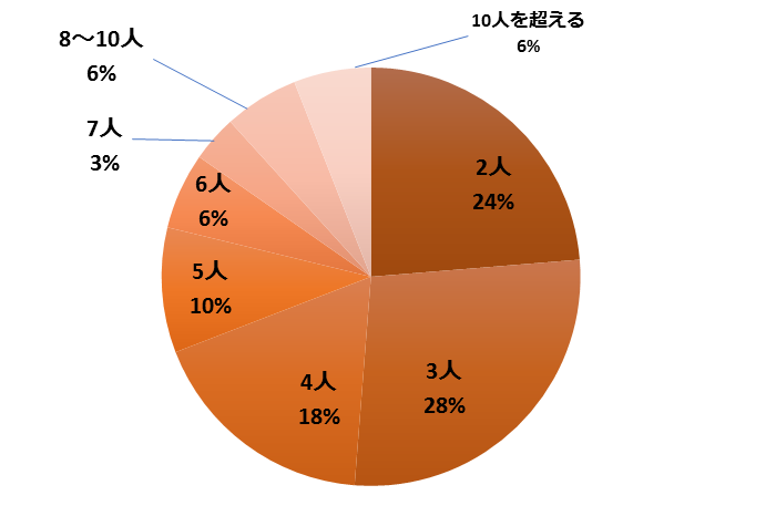 遺産分割を争った相続人の数は3人が最も多く28%です。4人以下で争っているのが約70%となり、複雑な家族関係や大規模な親族内で起こるよりも、身近な身内で揉め事が起きていると考えられます。