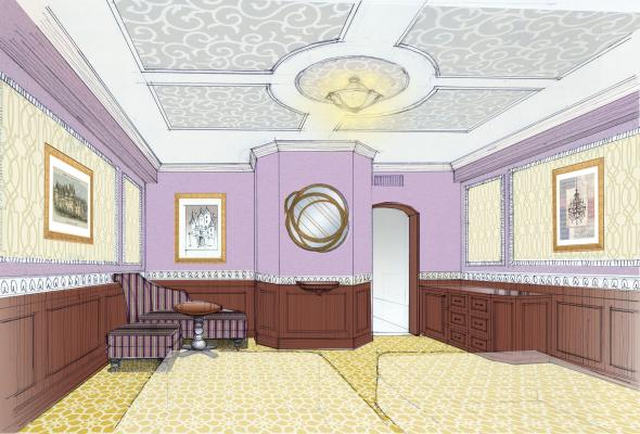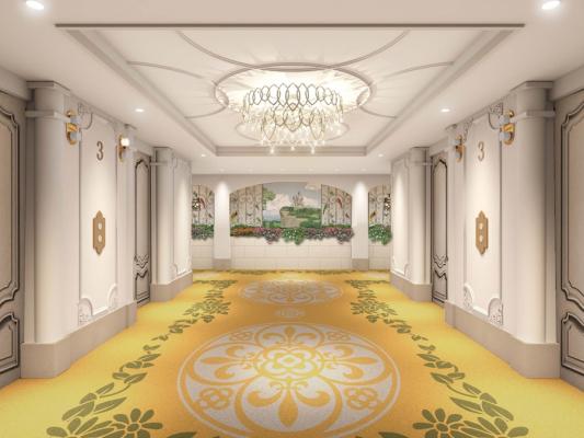 そして今回もお客様よりご好評を頂き、同3階においても51室を新装オープン。3階は「一晩中お花に囲まれたお城の中のゲストルーム」をテーマに、上品で華やかな空間を演出いたしました。エレベーターホールは細部にまでこだわり、森の中にたたずむお城を表現。ティアラをイメージさせる煌びやかなシャンデリアや、ランタンに見立てたブラケットランプ、お城のバルコニーからの風景が描かれた壁画など、テラスを彩る木々や花々、小鳥たちに囲まれた隠れた楽園を連想させます。