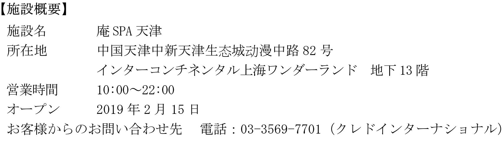 ホテルスパ事業を行なう株式会社クレドインターナショナル(本社:東京都中央区、代表取締役社長:白井浩一)は、純日本スパ『庵(アン)SPA(スパ)上海』を、中国・天津にある「ヒルトン天津 エコ シティ」に2019年2月15日にオープンします。