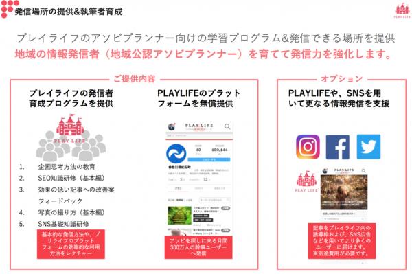 遊び×テクノロジーで地方創生を目指すプレイライフ株式会社( 本社:東京都渋谷区 代表取締役CEO:佐藤太一、以下、プレイライフ)は、2月1日より、従来の地方創生サービスに加え、情報発信者育成サービスの提供を開始いたしました。また、2月27日~3月1日の日程で開催される地方創生EXPOに出展することが決定いたしました。