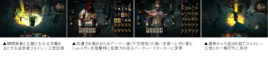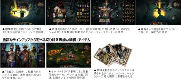 本作にはキャラクターではなく装備に対して固有のスキルが存在します。対峙する敵に対して最も効果的な戦闘力を、豊富な装備のバリエーションから瞬時に選択することが可能です。ジャンプや回避といった激しいアクション要素と素早い装備の切り替えが楽しめるダイナミック(動的)なゲームシステムを、全編を通してお楽しみいただけます。