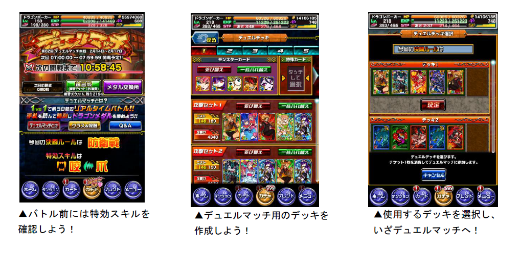 デュエルマッチでは、通常よりも高い効果を発揮する「特効スキル」が設定されています。今回の「デュエルマッチ」の特効スキルは、咬・爪です。特効スキルのカードをデッキに入れて、有利にバトルを勝ち進めましょう。